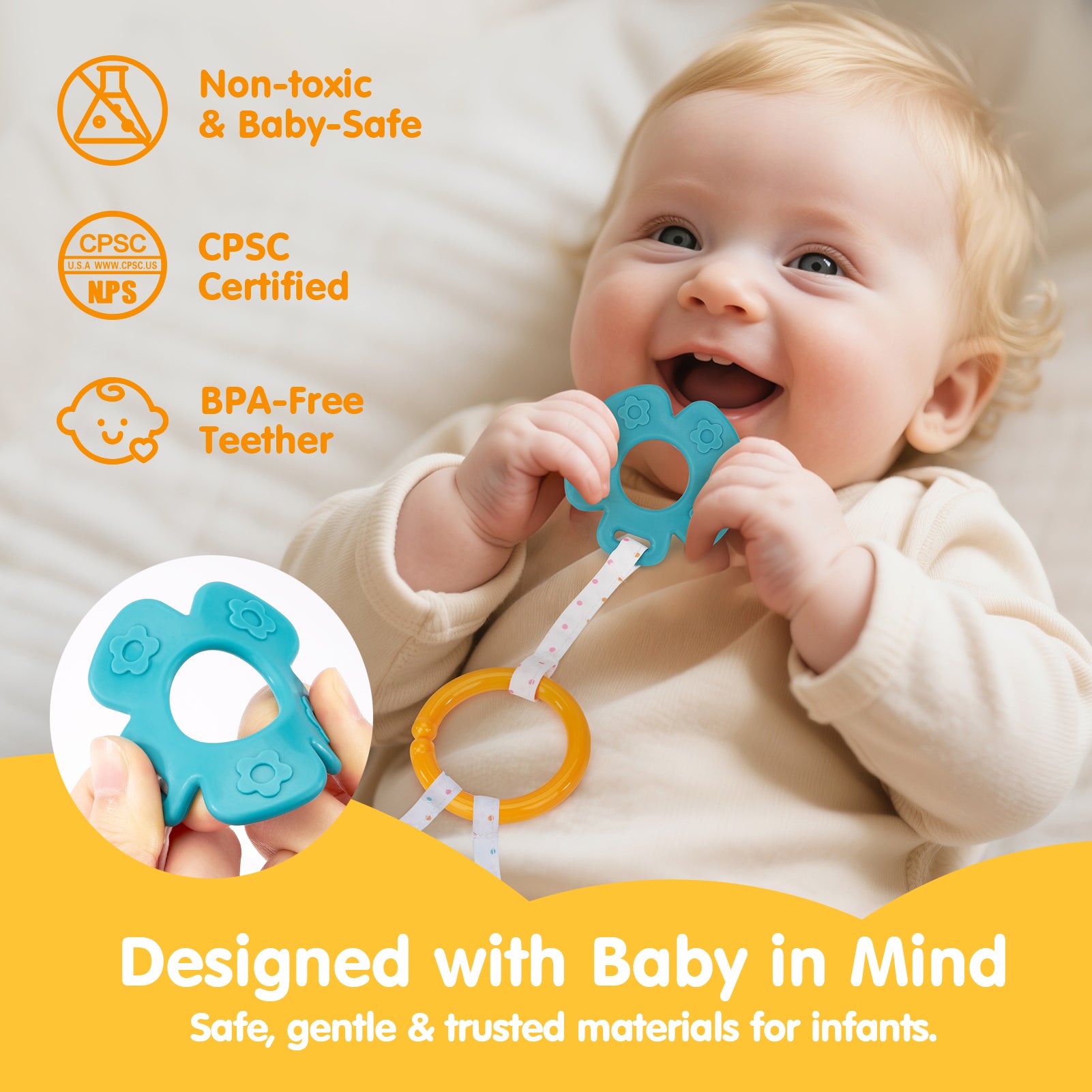 - 【Teething Relief Anytime】Includes a BPA-free flower teether that is soft, durable, and soothing for teething babies to chew on. Helps relieve sore gums while satisfying oral exploration needs. This teething toy keeps little ones happy through every stage of growth, whether at home or on the go.