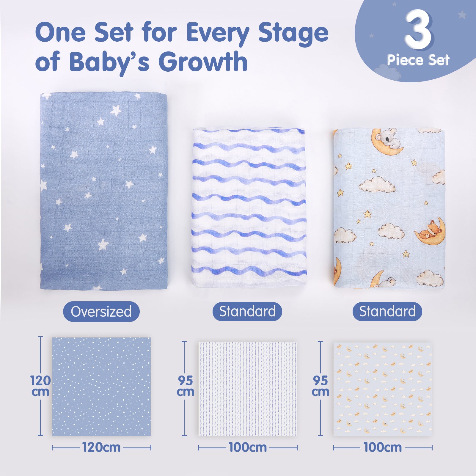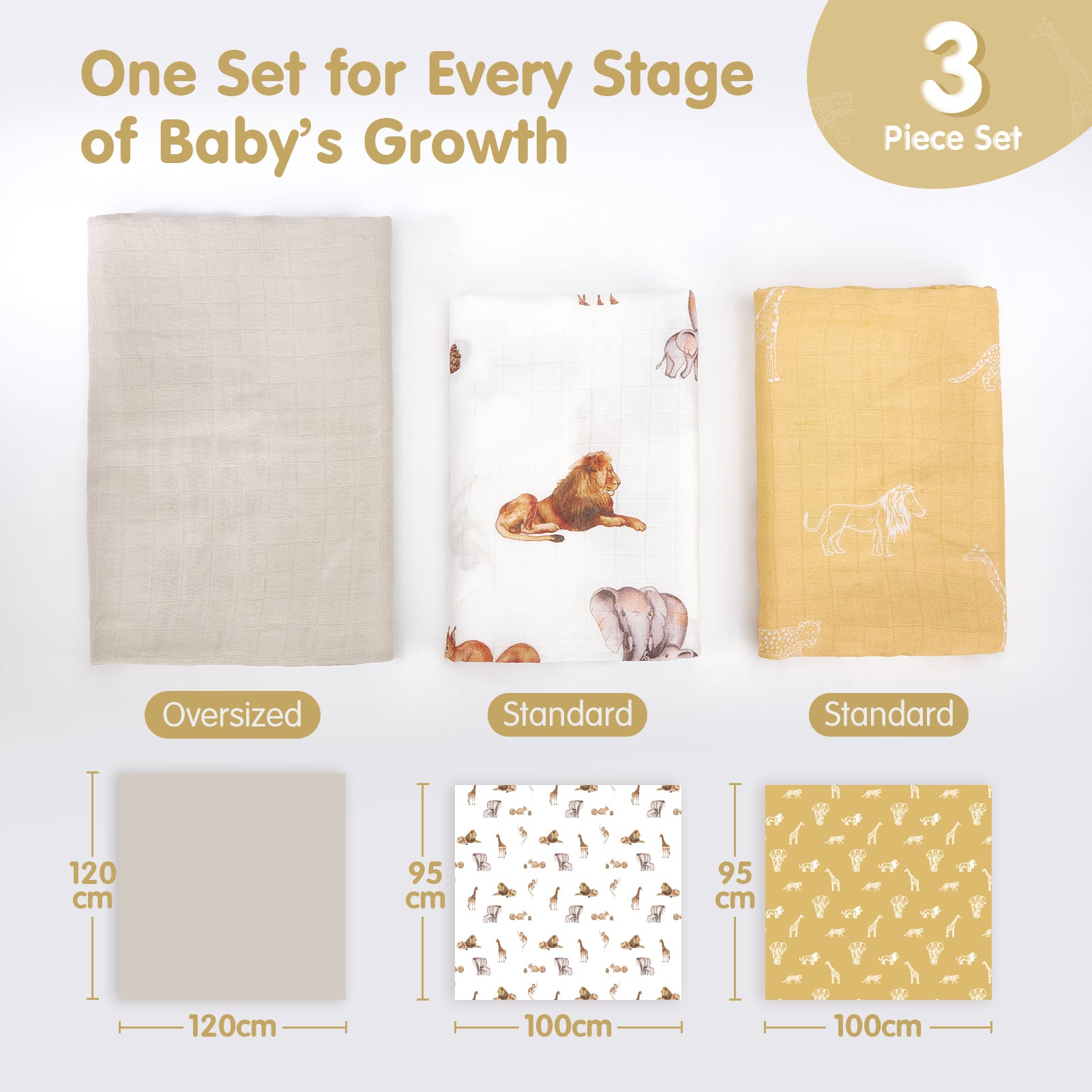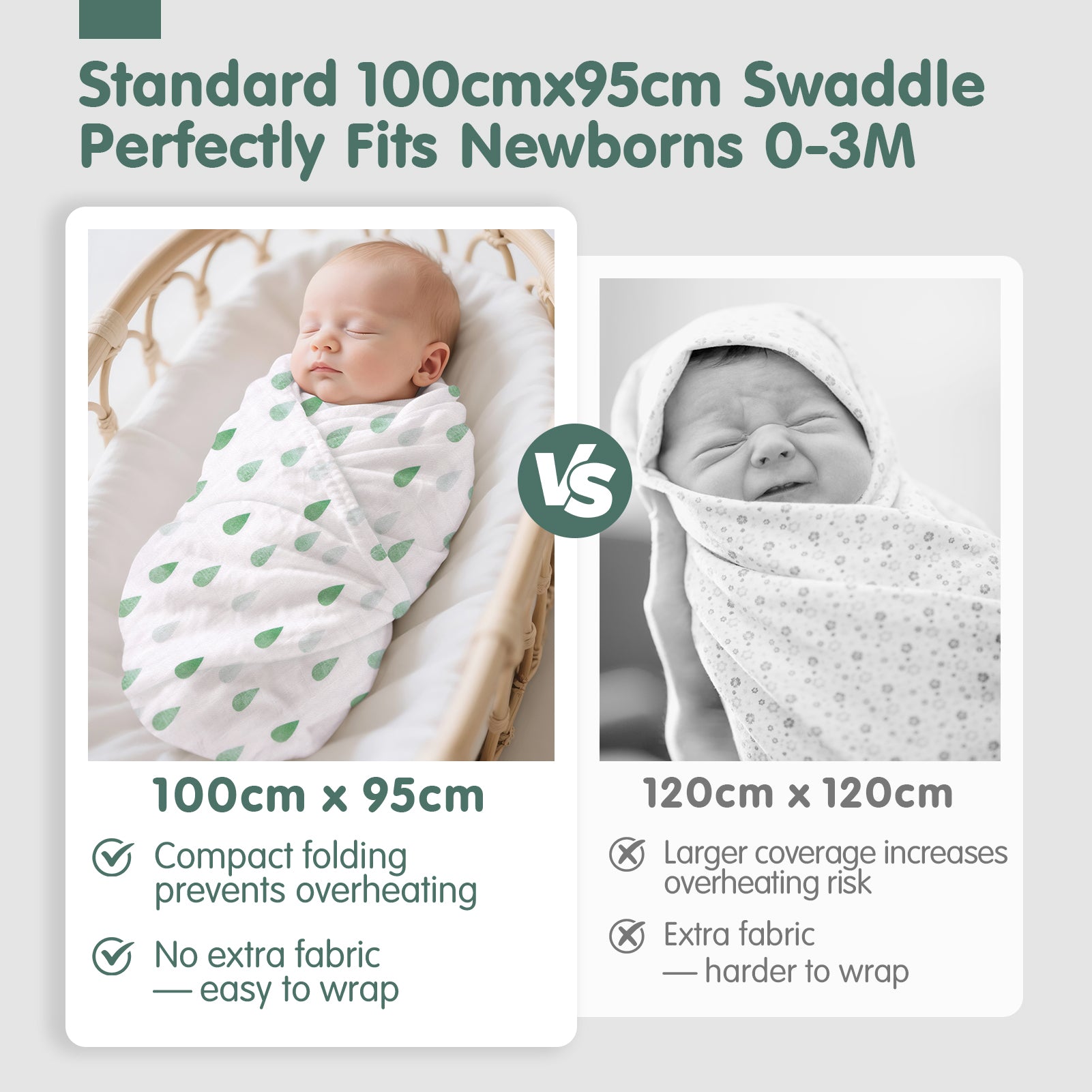 - Perfect Fit for Every Stage – 2 Sizes in 1 Set: Includes 1 large and 2 regular blankets. The 40×38 inch wraps newborns snugly without excess fabric, making it easy to swaddle and preventing overheating. The 47×47 inch grows with baby and doubles as a nursing cover, stroller blanket, or bath towel. Solves the common problem of swaddles being too small or too big, ensuring comfort at every stage