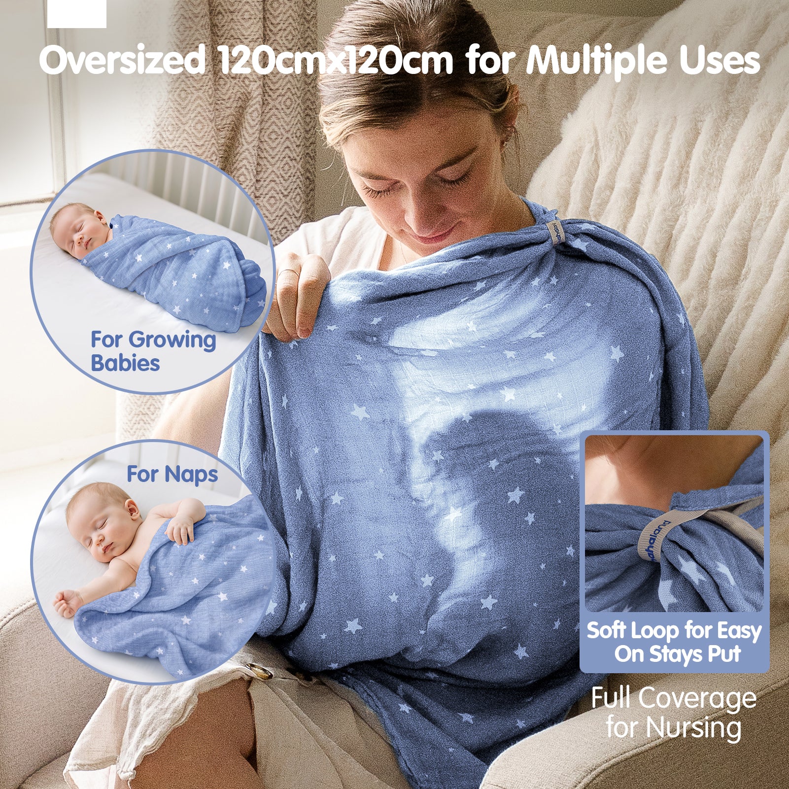 - Versatile Large Swaddle – Doubles as Nursing Cover: The large 47×47 inch swaddle isn’t just for wrapping—it easily converts into a nursing cover. Designed with a loop for quick, secure placement, it stays put while keeping your baby covered and comfortable