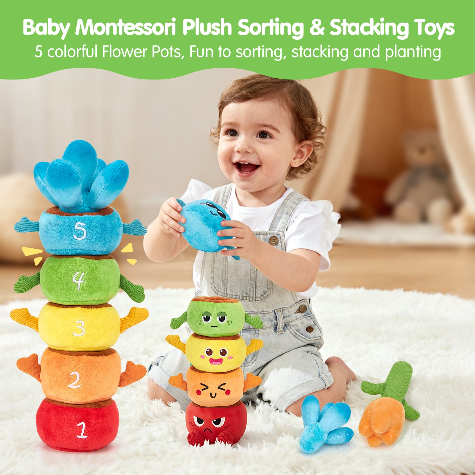 - Montessori Toys for 1 Year Old: This plush garden toy features 5 colorful potted flowers, each with unique textures, gentle rattles, crinkles, and jingles for multi-sensory play. Babies can pull, plant, and stack each pot, discovering new sounds and feelings while strengthening fine motor skills, grip control, and hand coordination through tactile exploration