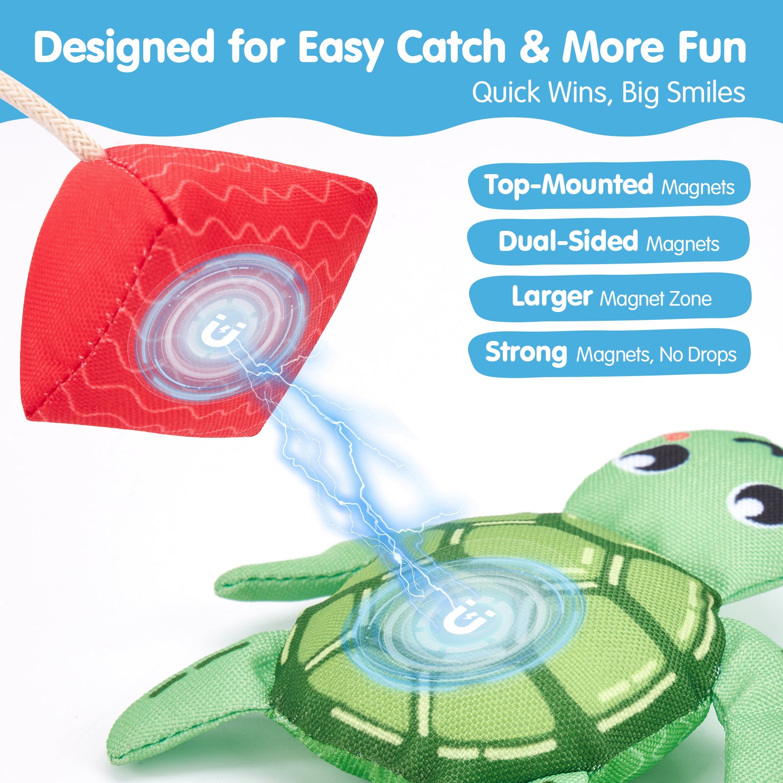 • Improved Magnetic Design for Effortless Play: Dual-sided magnets ensure easy fish catches, even if the fish flips over. The larger contact area makes it easier for little hands to connect the pieces, helping toddlers build confidence with every successful catch, making the play experience more engaging