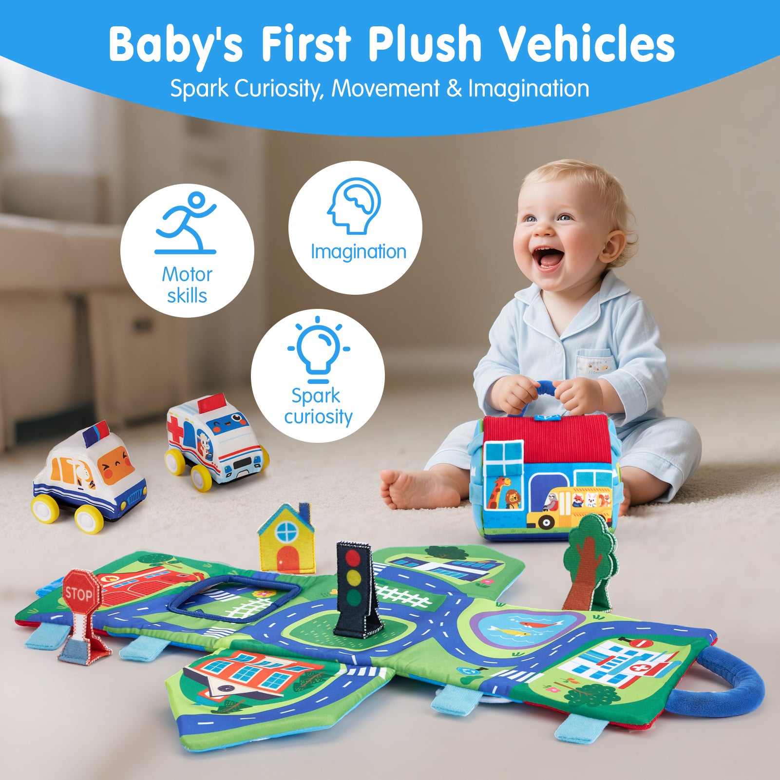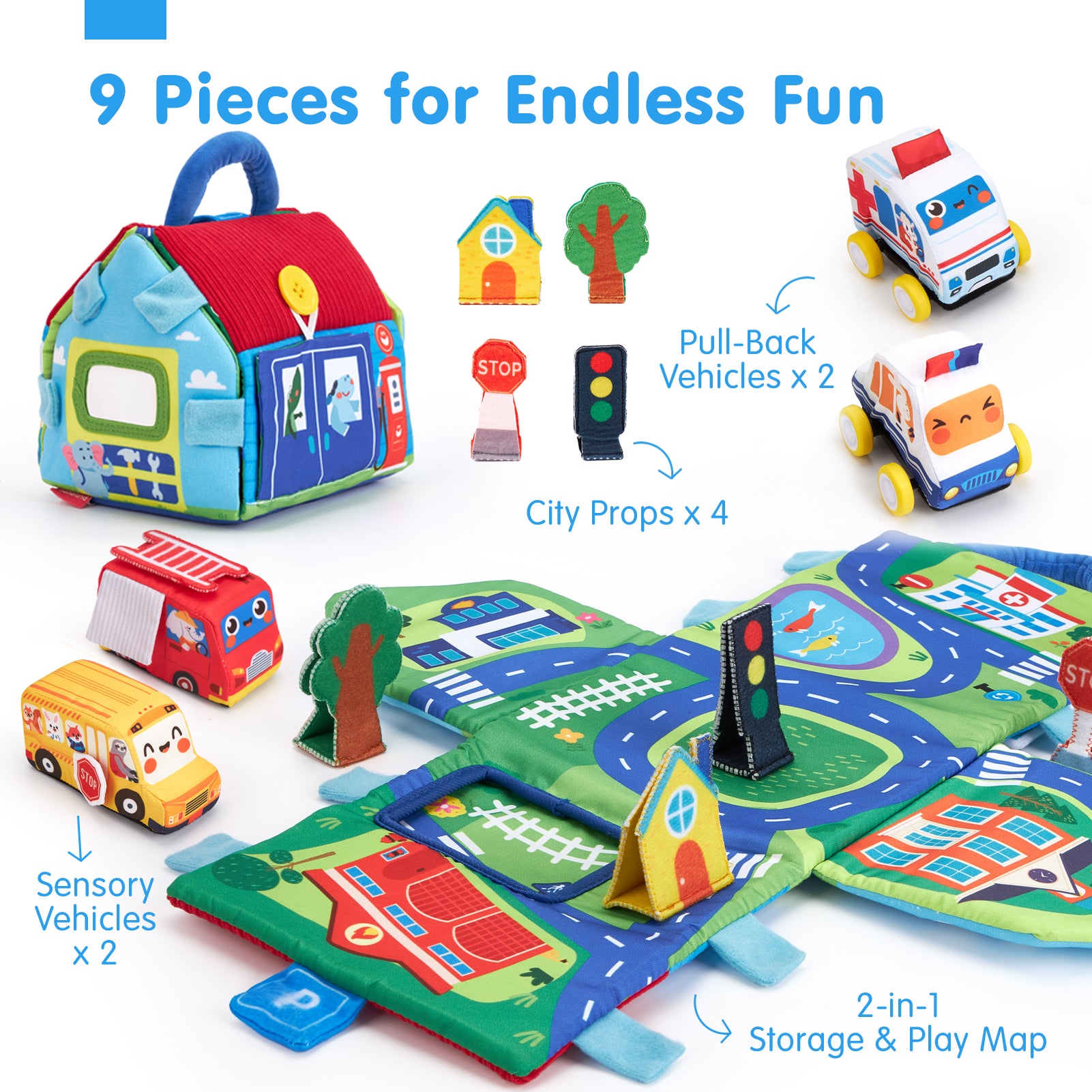 • 9-Piece Complete Play Adventure: Unfold a full adventure in seconds! Includes 2 pull-back cars, 2 crinkle sensory cars, 4 interactive accessories, and a foldable plush play mat that doubles as a carry house. Perfect for home or travel, builds motor skills, sensory discovery & imaginative play