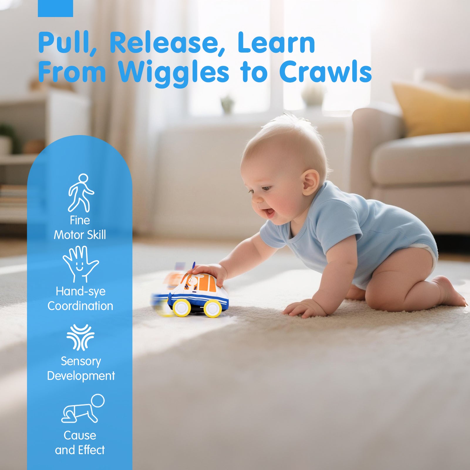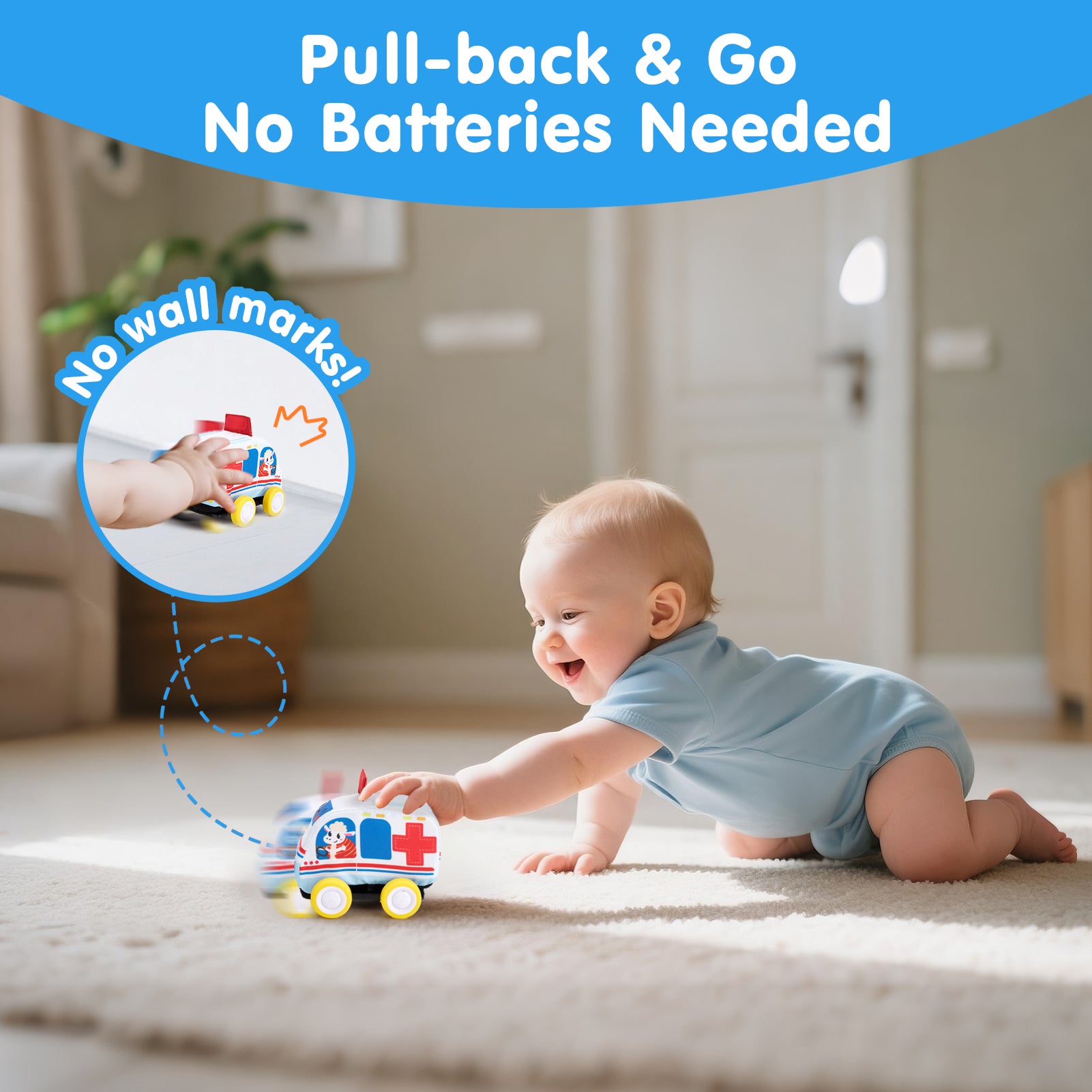 • Pull-Back & Go, No Batteries Needed: Babies pull, release & chase as cars zoom! Encourages baby crawling while teaching cause & effect