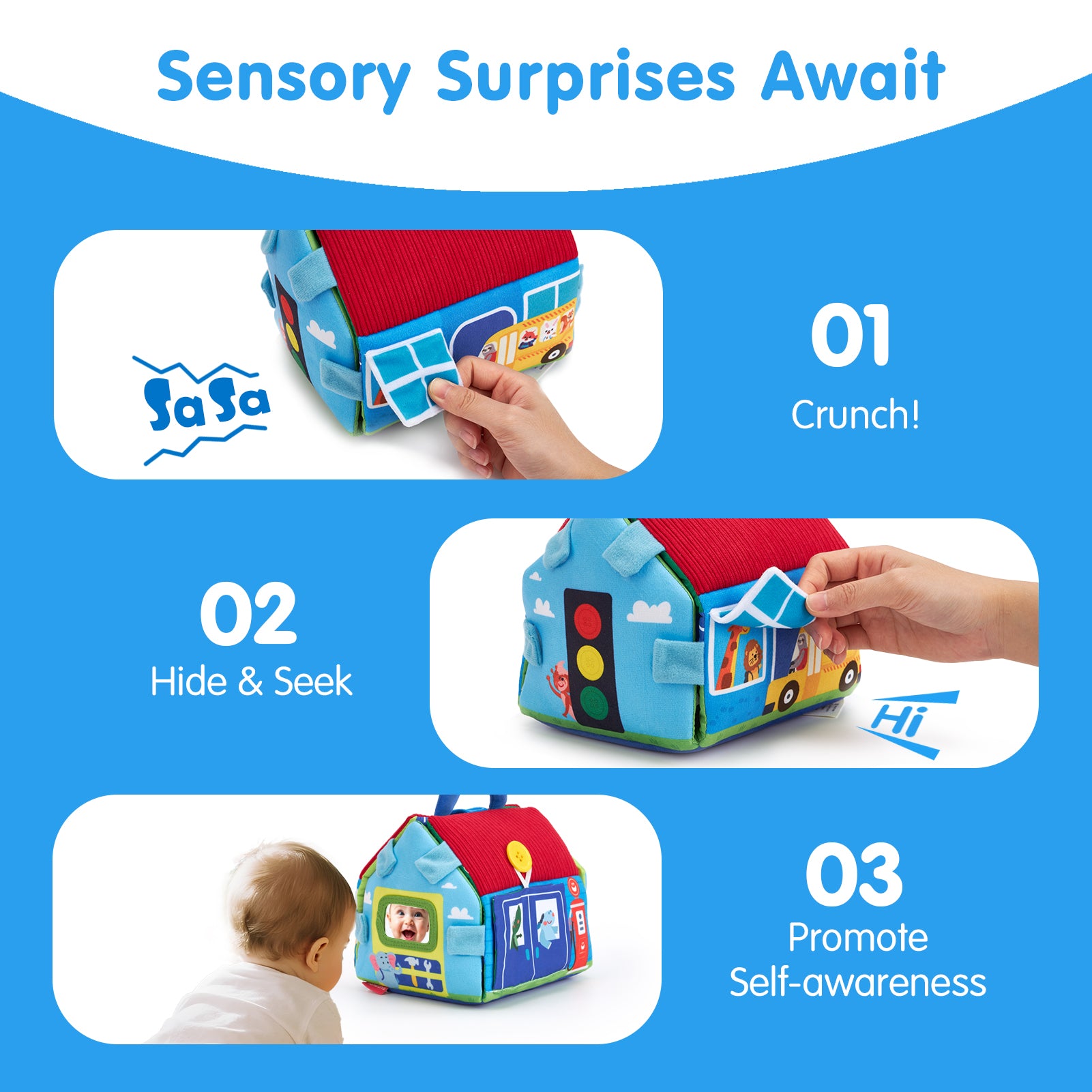 • Sensory-Rich Play: Features crinkly textures, peek-a-boo, and a baby-safe mirror spark curiosity & brain growth. Montessori-inspired learning and discovery