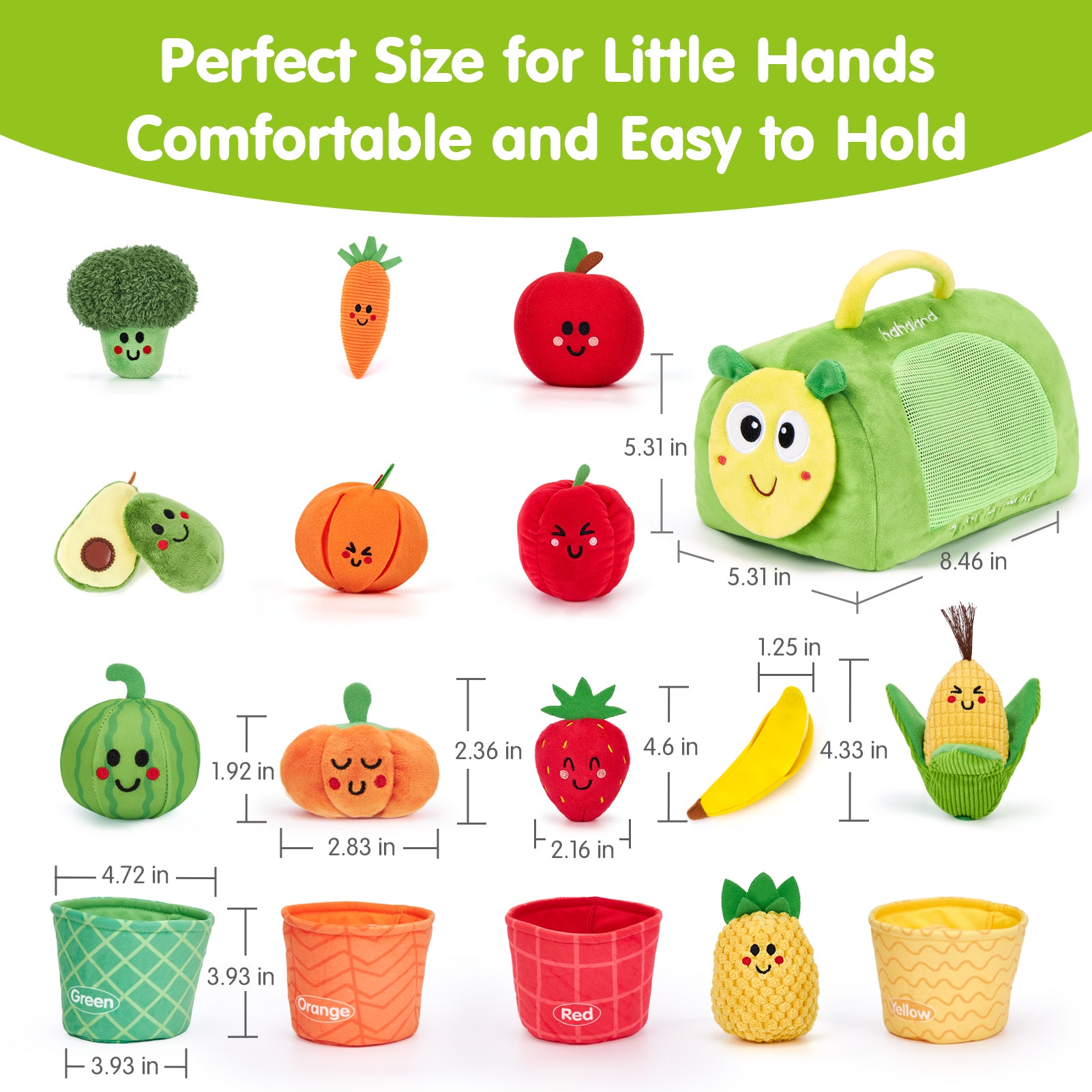- Sort, Match & Explore Colors: Bright baskets and soft fruits & veggies turn color sorting into an adventure to match, compare, and discover textures, sounds, and colors—early learning made joyful and hands-on