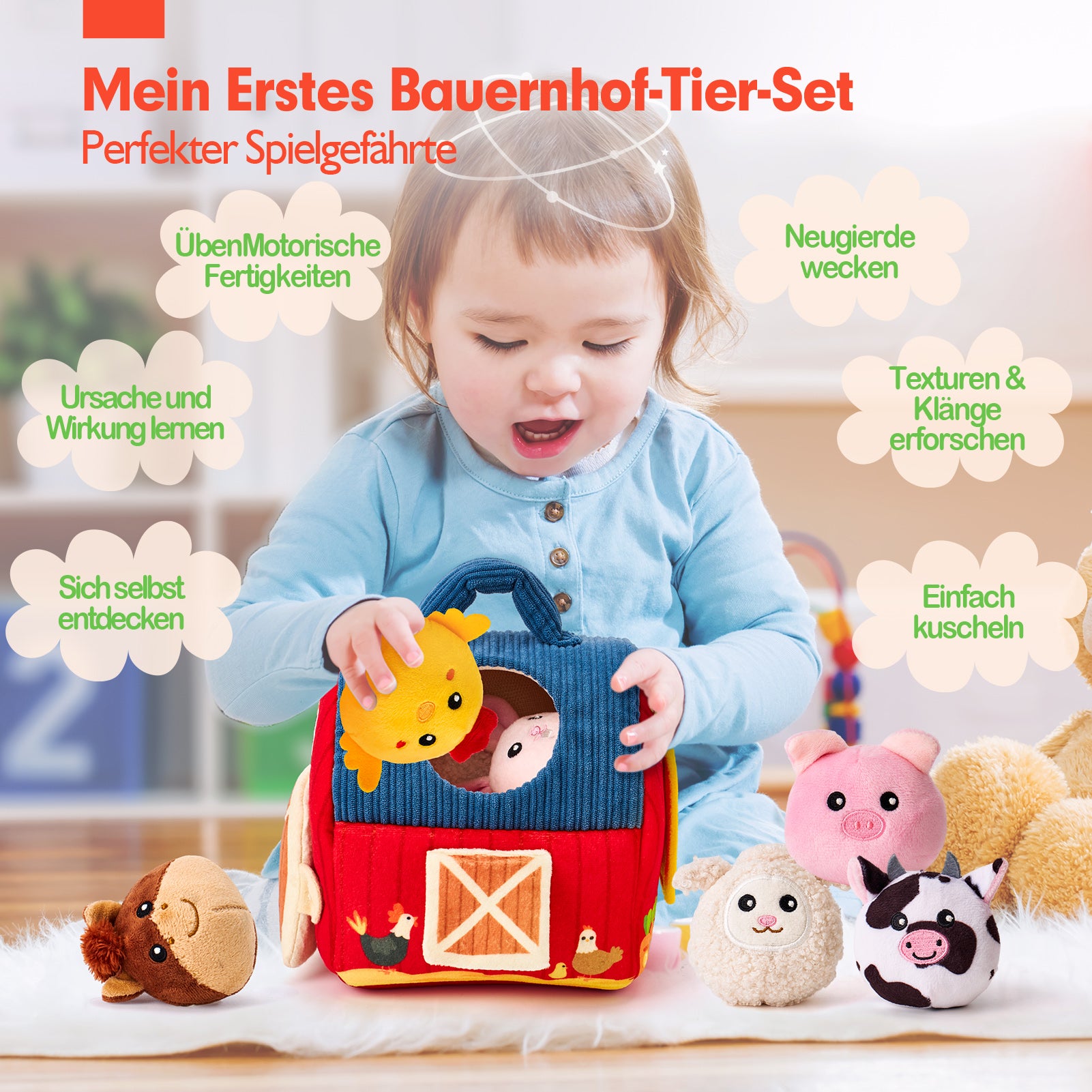 • 【MY FIRST FARM ANIMAL SET】This delightful set includes a charming farm house & 6 animals. Crafted with love and care, these plush toys are more than just cute companions, they are a gateway to a world of sensory exploration and developmental play.